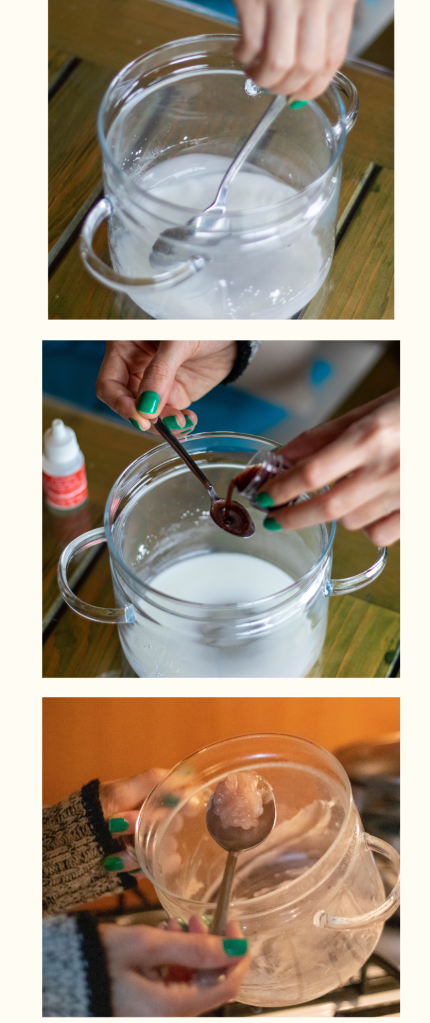- Isıtma aşamasında sürekli karıştırıyoruz, bir yandan da renk verici boyamızı ilave ediyoruz.