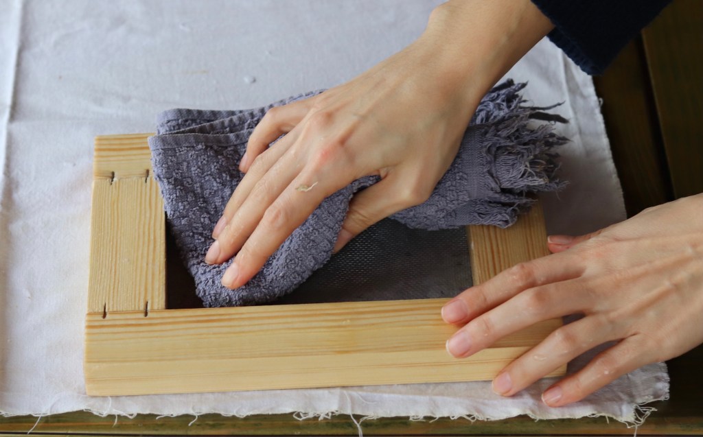 Bu noktadan sonra iş, elekli çerçeve ile kağıdı yeniden toparlamaya geliyor. Elekli çerçeveyi kovaya nasıl koyduğumuz önemli. Eleklerden içi boş olanı, telli olanın zımbalı kısmı üzerine yerleştirip kovaya öyle daldırırsak kağıdımızın kenar kısımlarını da netleştirmiş oluruz.